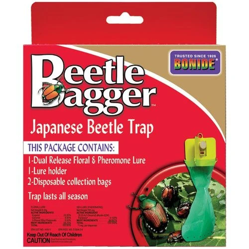 Bonide Japanese Beetle Trap is a complete kit that includes one trap, one dual lure, and two collection bags. The trap lures Japanese Beetles into the collection bag which corrals them securely. Using a long lasting dual floral and pheromone scent to attract them, this kit is designed for residential use. The bag easily hooks to vane slots that dispense the attractant. A hanger loop makes the Japanese Beetle trap easy to place. Hang traps from a metal or wooden stake three to five feet above the ground and at least eight to 25 feet downwind from the plant you are protecting. The trap should be located downwind of the foliage to intercept the beetles heading toward it. Do not place the trap near or in the foliage as it will attract more beetles.